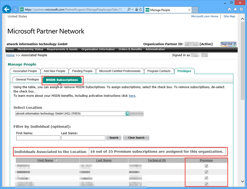 Die Liste zeigt die Partner-Konten an und in der letzten Spalte eine Checkbox, ob diese einem MSDN-Premium Konto zugewiesen sind.
