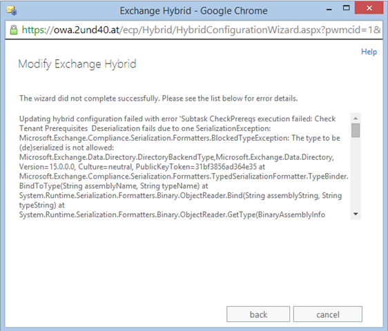 Für alle die aktuell versuchen einen Exchange 2013 Hybrid Wizard auszuführen. Leider gibt es seit kurzem einen kleinen Bug der dafür sorgt das dies aktuell nicht möglich ist.