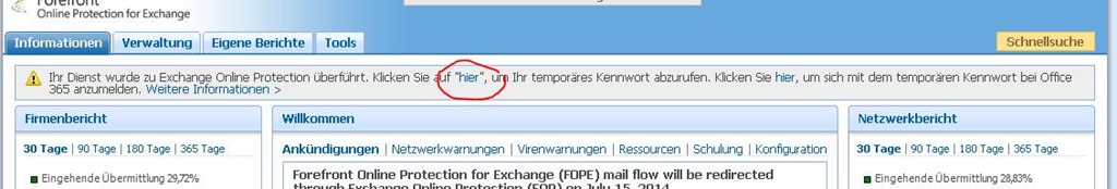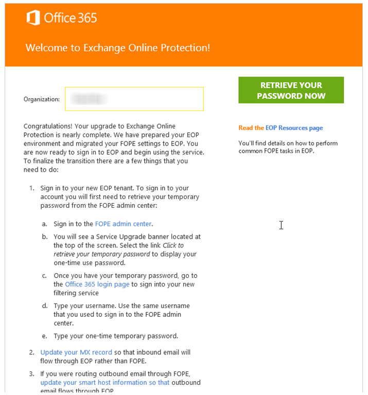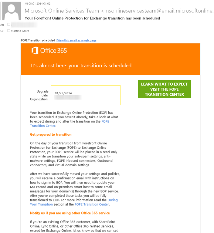 Kunden, die das alte FOPE Portal genutzt haben, werden derzeit automatisch auf das Office 365 Portal migriert, da EOP ja dort verwaltet wird. Es werden vor der Umstellung einige Benachrichtigungen per E-Mail versendet. Im FOPE Transition Center kann man dazu viele Schritte nachlesen.