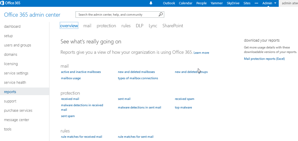 Office 365 offers already a lot of build-in Reports for the various Services within Office 365. You can find those Reports in the Admin Dashboard and the menuitem Reports. Office 365 Administrators can look at those Reports. Please be aware that those reports are visible if you have at least one Exchange Online license within your account (Thanks Erwin B. from MS Support for helping me figure this out).