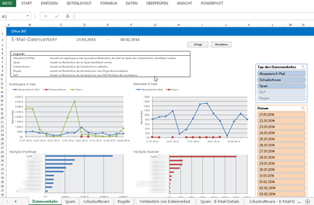 But there is more within Office 365: you can make your own reports about Mailtraffice with Excel. Use the Mail Protection Reports! Download the corresponding version of your installed Excel Version (in most cases this will be the 32bit version). Install the reports and open the Shortcut on your Desktop.