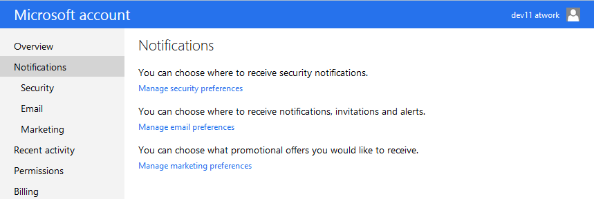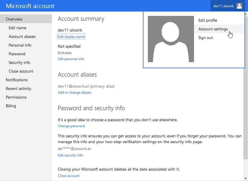 In my case the Microsoft Account is called dev11. Open your user menu in the right corner and click Account settings.