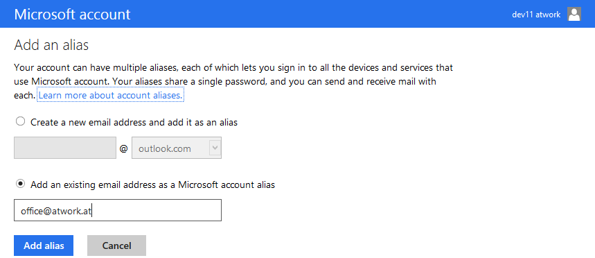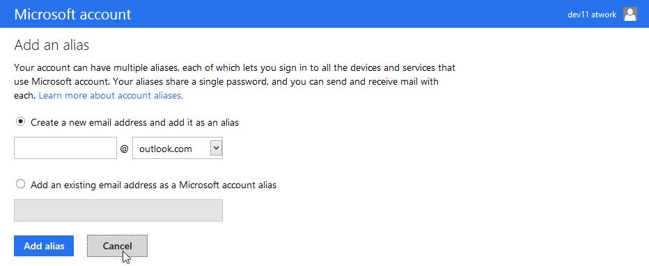 After the login the page Add an alias is presented again. Click Cancel.