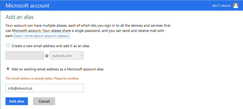 The solution to fix this is to add another email-address to your Microsoft Account. This is no big deal – but a little hidden how to accomplish this task.