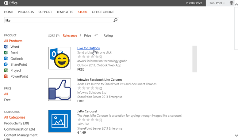 In our case we search for “like” and find “Like for Outlook”. Open the app link like here.