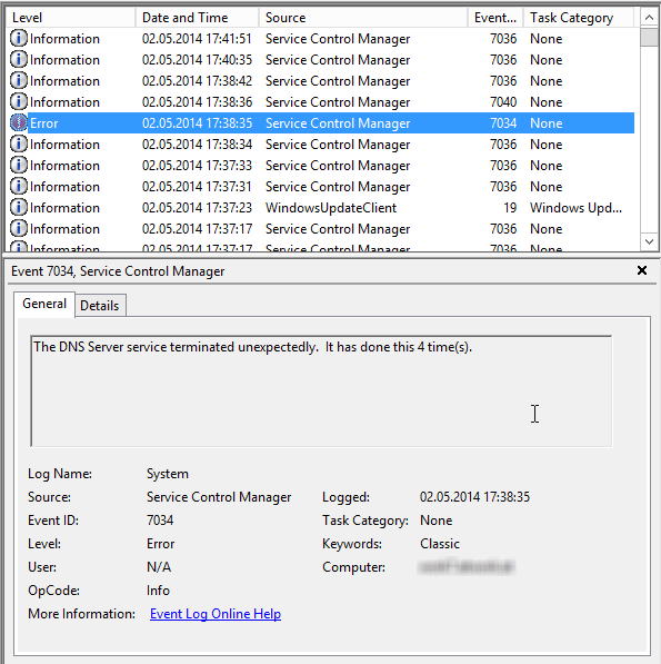 Was war passiert? Nach dem letzten Patchdienstag wurden die Updates routinemäßig auf unseren Servern eingespielt. Nachdem DNS Server ja auch immer redundant ausgelegt sind, ist es vorerst gar nicht aufgefallen. Erst bei einer Kontrolle des Servers (um eine neue Zone hinzuzufügen) habe ich bemerkt, dass der DNS Server nicht mehr läuft. Im Eventlog wird Event ID 7034 geloggt.