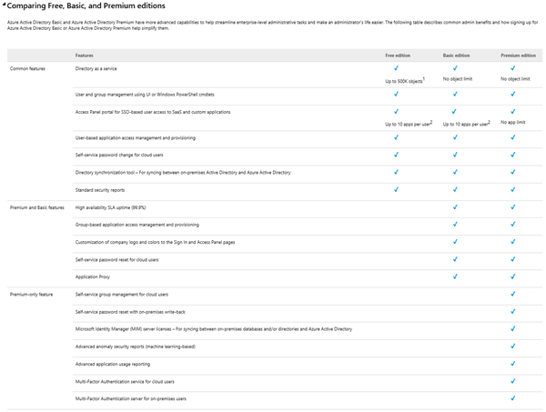 Alle Editionen von AAD sind in Azure Active Directory Editions aufgelistet und vergleichbar: