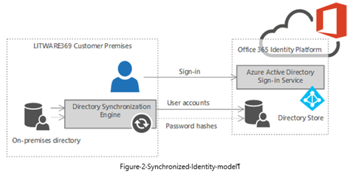 Die Synchronisation erfolgt mit eigenen Tools: AD FS oder DirSync oder Microsoft Forefront Identity Management (FIM mit dem Azure AD connector).
