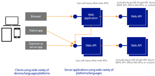 Leverage-AAD-for-modern-business-apps.docx informiert, wie die Authentifizierung aus einer App gegen AAD grundsätzlich funktioniert. Bei einem Web Browser muss sich der Anwender anmelden. In einer native App (Phone, Tablet oder PC) muss die App einen User per Web API anmelden. Auch eine Web App kann sich gegen eine Web API anmelden, genauso wie ein Dienst oder eine Server App.
