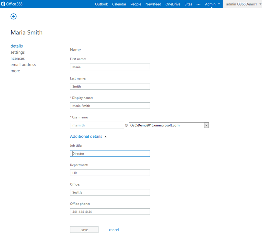 So let´s have a look into the user properties on each side. If you don´t have a Office 365 account for playing with, simply open a new free 30-day Office 365 tenant. Once this is done, use this tenant.