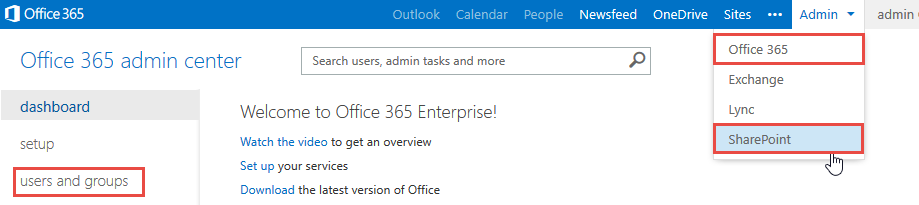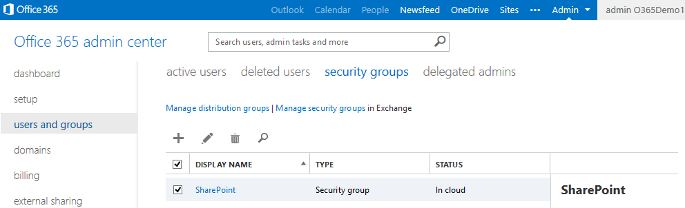 Now login as an administrator on the Office 365 portal and open browser tabs for the Office 365 users and the SharePoint users. Create some test users on the Office 365 side.