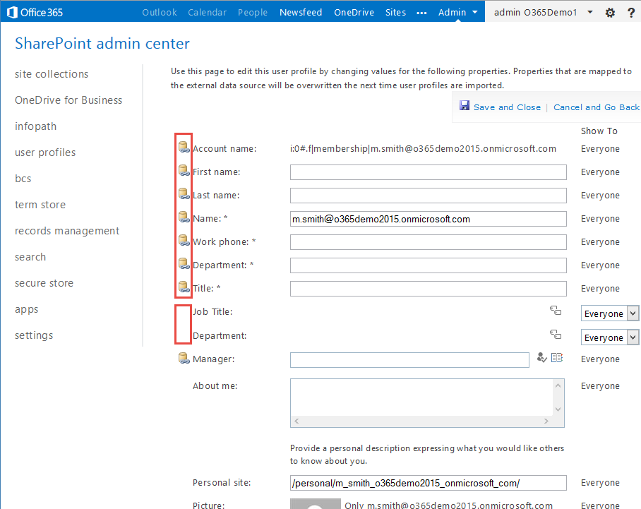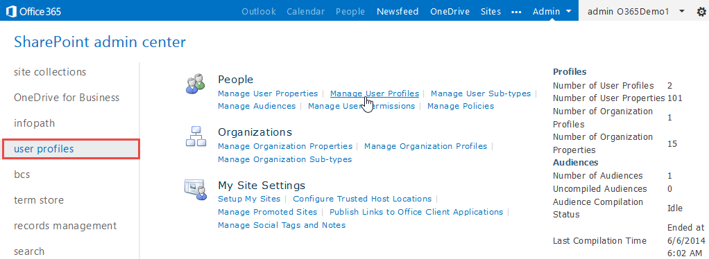 Picture Source and technical article see Manage SharePoint Online user profiles from the SharePoint admin center.
