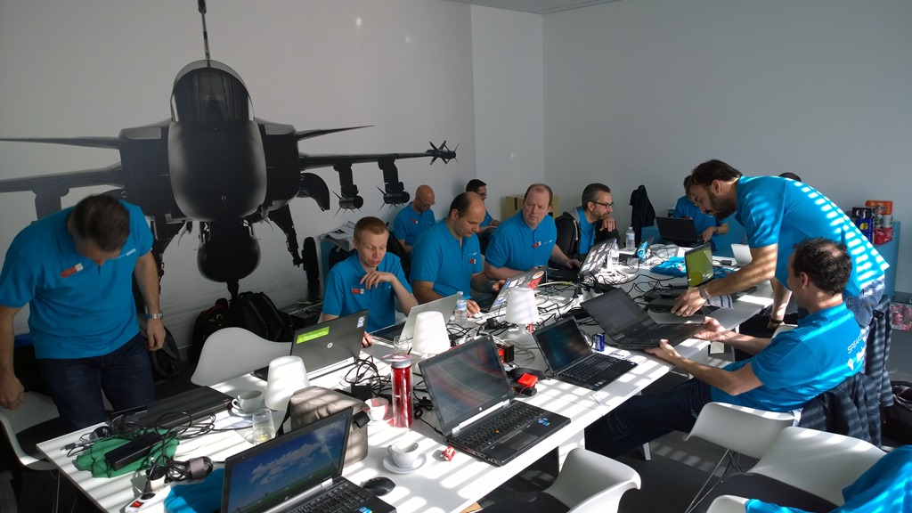 The whole Saturday was planned very well, see location and sessions. All speakers got blue T-Shirts with name-tags to easy communicate with them. See a snapshot of the speaker´s room with a cool combat jet in the back.