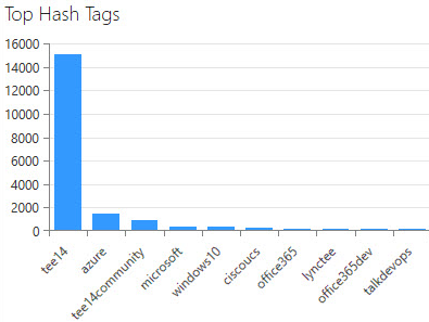 Die Auswertung der verwendeten Hashtags (neben unserem Filter #TEE14) sieht so aus: Azure, tee14community, Microsoft, windows10, ciscoucs, office365, lynctee, office365dev und talkdevops.