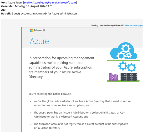 Das Microsoft Azure Team versendet zur Zeit Newsletter, wo Azure-Kunden darüber informiert werden, dass in Kürze Azure-Subscription-Administratoren Mitglied des Azure-Active Directories sein müssen.