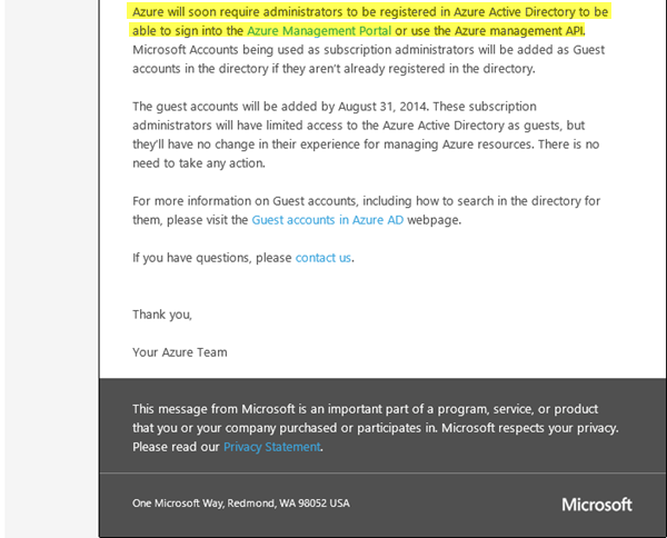 “Azure will soon require administrators to be registered in Azure Active Directory to be able to sign into the Azure Management Portal or use the Azure management API. Microsoft Accounts being used as subscription administrators will be added as Guest accounts in the directory if they aren’t already registered in the directory.”