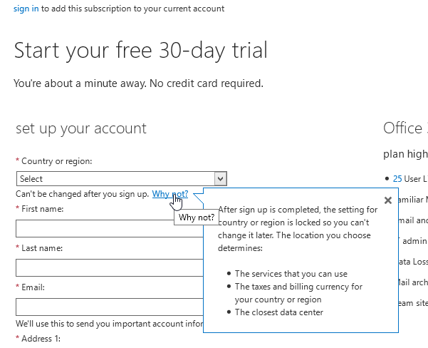 This Region settings and the tenant location are set whenever you open up a new Tenant – during the original sign-up process.