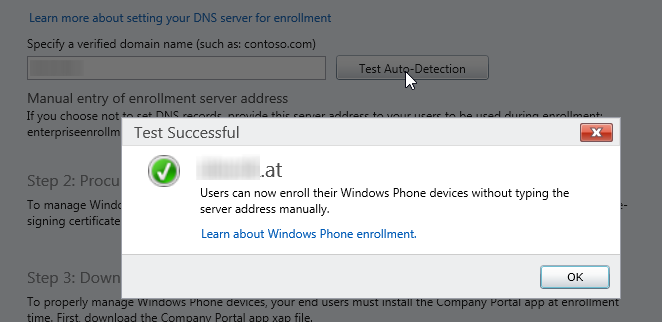 If you want to add your mobile devices you’ve to name a management server. In most cases I left it how it was, enterpriseenrollment-s.manage.microsoft.com. Some customers prefer to add their own domain and that’s what today’s article is about.