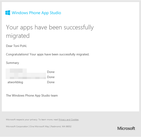 Man erhält dann eine E-Mail, dass die Apps migriert wurden.