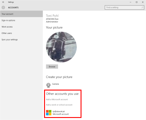 Hierzu ein kleiner Rückblick: Unter Windows 8 gab es nur die Unterstützung des Microsoft Accounts (MSA) um auf Cloud-services wie etwa OneDrive zuzugreifen. Jedes Windows-Konto kann in den Konto-Einstellungen mit einem MSA verbunden werden. Diese Unterstützung gibt es nach wie vor auch in Windows 10.