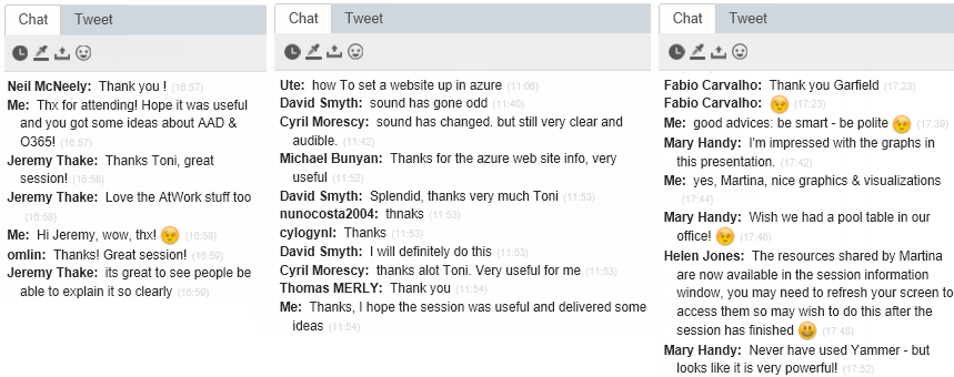 We hope you liked our sessions No more SPO Public Websites. What´s next?, How to (remote) control Office 365 with Microsoft Azure and Who needs Yammer – we have SharePoint!