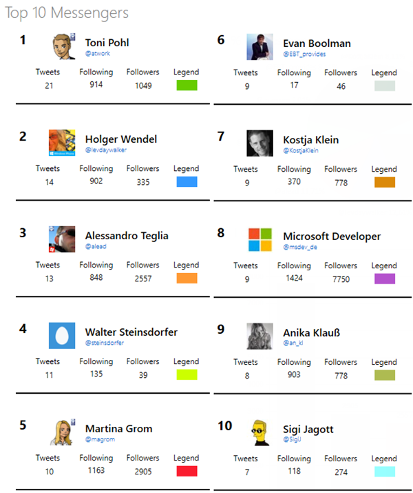 #mvpbuzz, #windows10, #munich and so on. And the usual suspects (@HeikeRitter, @magrom, …) in the top mentions…