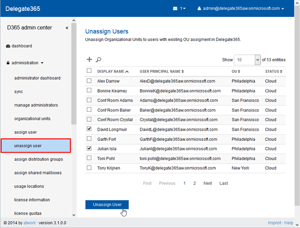 - New: Unassign users in the administrator menu: With this new module users who are already assigned to an OU can be unassigned. This module is only available for portal admins and works exactly in the same way as the assign users module: Search the users, mark them and click the “Unassign” button.