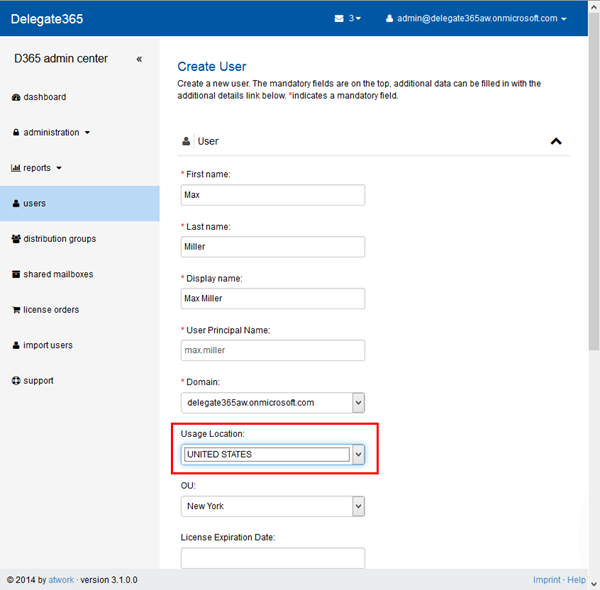 - New: Usage Location in Administrator´s management: When an admin creates new users he has to set a usage location. Since the country list is very long we decided to add the usage location per admin in the “manage administrators” menu. In there the default usage location (many companies have locations all over the world) can be set per admin. If this is done and the admin creates a new user in D365 the usage location is automatically preselected for his own country.