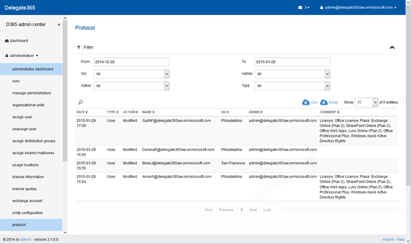 Portal admins get a new module in menu “administration / protocol”. In there are several filters to define the timeframe, OU, admin, type and action of the protocol list. The list shows all changes like license, the main fields, OU changes and similar and can be exported as comma separated values list (CSV) file or as Excel file.
