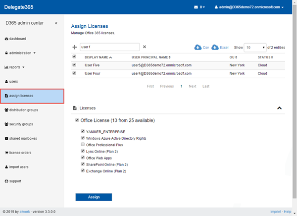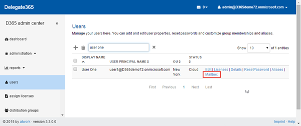 Assign Licenses helps admins to set or remove licenses for a bunch of users quickly.New Mailbox settings: In D365 version 3.3 new Exchange features have been added. These functions can be set per user in the “users” list with the “Mailbox” menu.