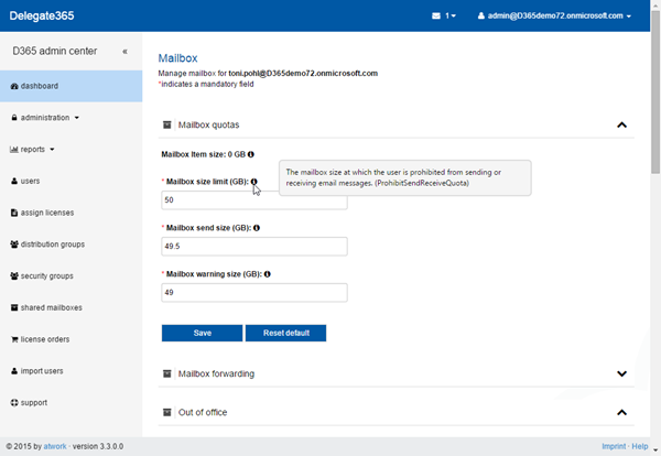 The “Mailbox” menu consists of three sections: Admins can define the Mailbox limits, an email forwarding and Out-of-the-Office (OOF) settings for each user.