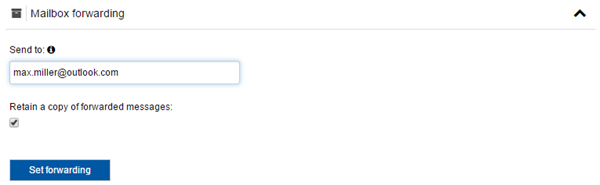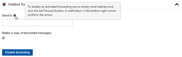 To disable the forwarding click the button “Disable forwarding” (and confirm the “Do you really want to disable forwarding the mailbox?” question).