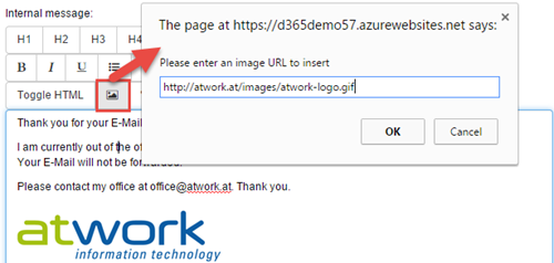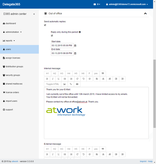- Out-of-Office Messages (OOF): The checkbox “Send automatic replies” defines if OOF messages are sent or not. If set, the Admin can additionally set OOF-messages only for a specific timeframe. This is the same functionality as in Outlook. A small HTML editor can be used for formatting the text. If you prefer to input HTML text, click the “Toggle HTML” button and write or copy the email message there.