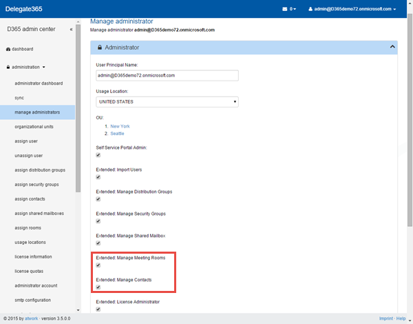 Permissions for Contacts and Meeting Rooms: As before, define the permissions of an administrator in the manage administrators settings. Permissions for “Manage Meeting Rooms” and “Manage Contacts” have been added.