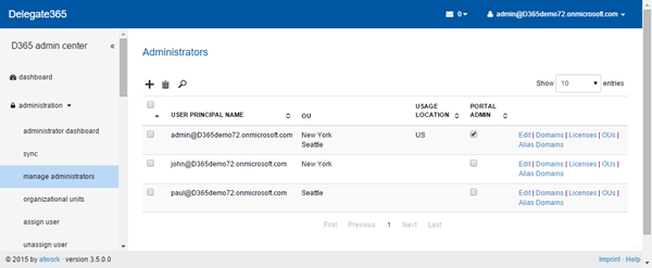 Manage administrators list cleanup: The list has been cleaned up and now shows no longer all permission checkboxes but just the columns “User Principal Name, OU, Usage Location, Portal Admin” and the menu links.