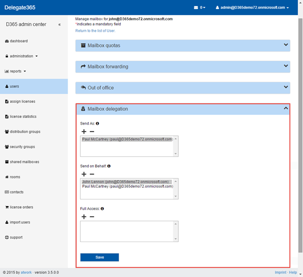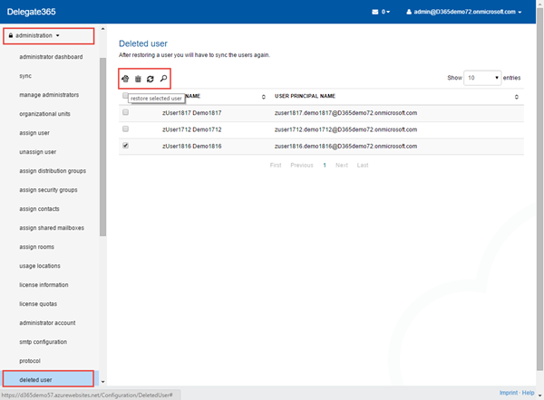 This is a helpful feature available for global admins to restore users who have been deleted by mistake. Also licenses of users will be restored (if there are enough licenses available in that OU).New Mailbox delegations: User mailbox permission settings can now be set by an admin.