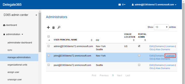 The user picker follows the same rules as described above and shows all users within the same OU’s as the logged in admin. If there are permissions set for users outside the own OU’s these users are also visible in the permission list and could be removed.Manage administrators licenses: We got some requests that scope admins shall only use special licenses – and not all licenses available in the Office 365 tenant. We developed that feature.