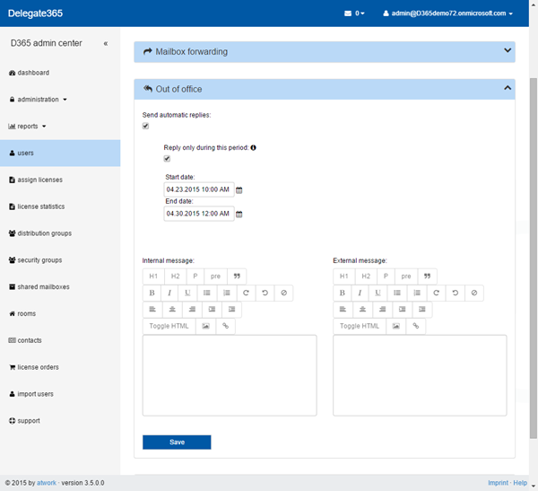 Delegate365 version 3.5 is another major release. There are many new features like support for resources/rooms, contacts, sync-updates, support for restoring soft deleted users, management of members of all OU’s, mailbox delegation, user’s MFA when creating users, new restrictions for licenses for admins and some more updates.
