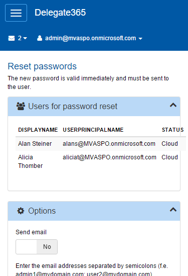 Bulk operation user password change: If multiple users are selected and “Reset passwords” is used, a web form follows where admins can set the password reset, if emails should be sent and if the marked persons must change their password the next time they sign in.
