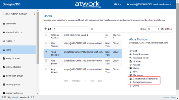 Convert User to a shared mailbox (and Convert user to resource): If a user is selected in the users list there are now two new features where the user object can be converted as shown below.