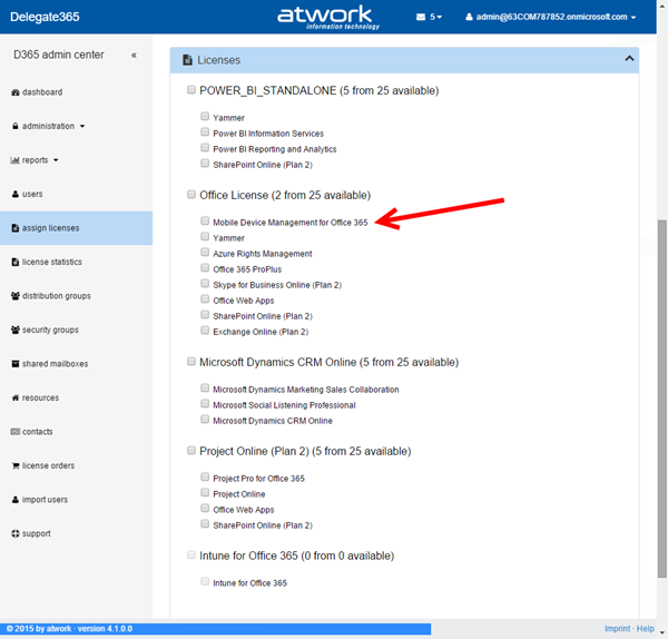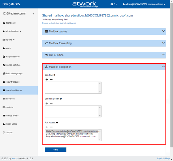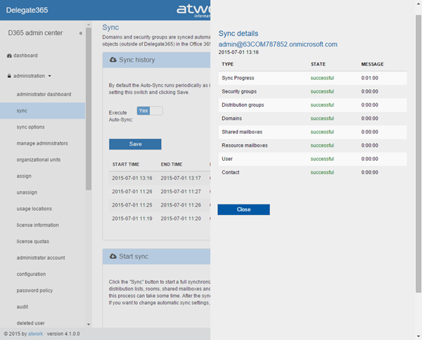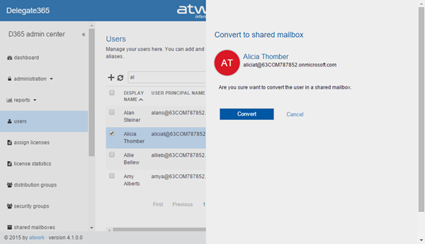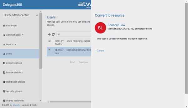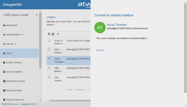 Shortly we released Delegate365 version 4.1 with many new features. Users can now be converted to shared mailboxes or resources, “rooms” have been renamed to “resources”, Shared Mailboxes now support all possible permission sets, there’s a new sync switch and a new sync history with more details and additional sync options. Also the assign licenses have been improved and D365 now uses the same friendly license plan names as in the Office 365 portal. See the details here.
