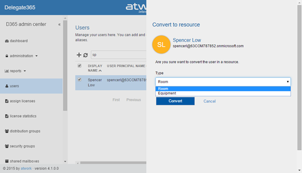 Convert user to resource: The same procedure works to convert a user to a resource. In the task pane the admin can select the type: Room or Equipment.