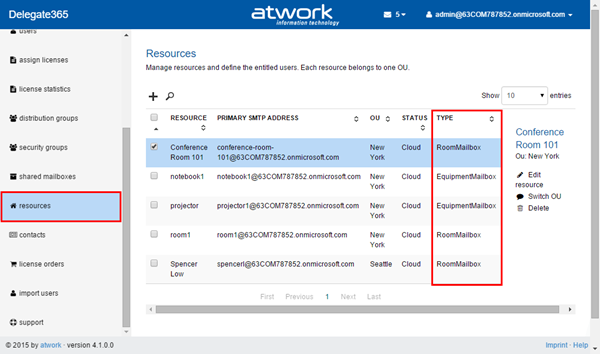 Info: Right now it is not possible to convert a shared mailbox or a resource back into a “normal” user. We are working on that…“Rooms” have been renamed to “Resources”: In D365 we added support for rooms and equipment, so we renamed the menu to “resources” as shown below. Also there’s a new column “Type” showing of what type the resource is.