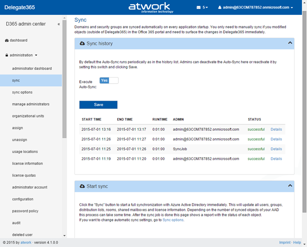 In the screenshot above there were three manual sync jobs started by admin@… and one automatic sync job. The “Details” link opens the task pane and shows the single operations with their duration and their status.