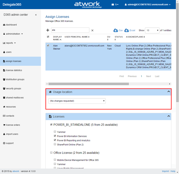 If there were errors in a specific sync operation the status turns red and the error message is protocolled in the “Message” column. The sync history shows the last 10 operations and is automatically deleted in the database after 30 days.Assign licenses with optional usage location: Admins can bulk assign Office 365 licenses in the administration / assign licenses menu. Now the usage location (which is mandatory in Office 365 to assign a license to a user) can be set. Additionally – if Admins want the usage location of their users unchanged, the can use the option “(no changes requested)” which is default.