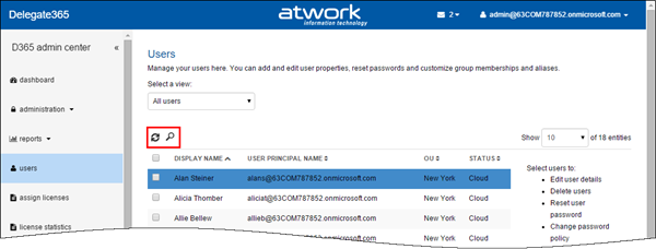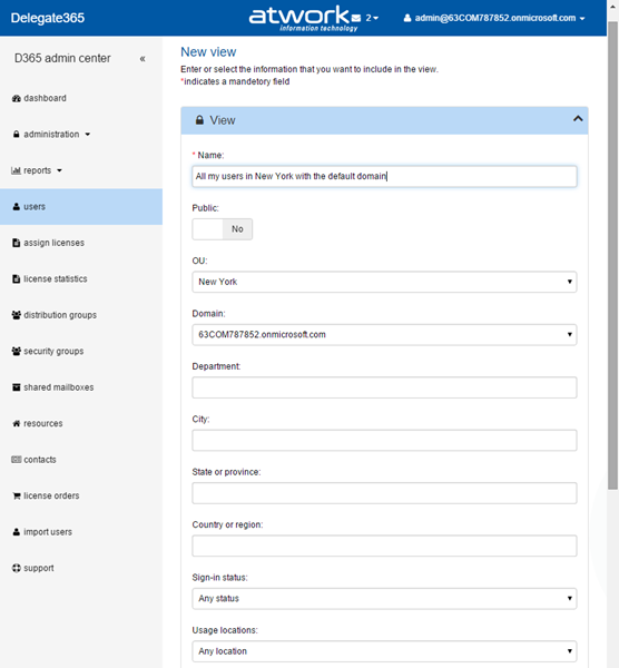 If you specify more than one condition this means a logical AND. So – as in the screenshot above - if you select the OU “New York” AND the domain “63COM787852.onmicrosoft.com”, only users will be shown who have the UPN *@63COM787852.onmicrosoft.com AND are in the OU “New York”. The more filters Admins specify in a view the less users will be shown.