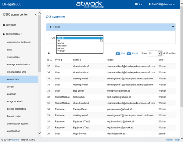 New: OU overview: In the administration menu there’s a new feature “OU overview”. This page delivers all objects belonging to any or a specific OU in D365. This list also can be exported to a CSV or Excel file with one mouse click.