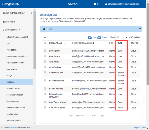 Unassign OU: The same goes for administration / unassign. The “type” column was added here as well.