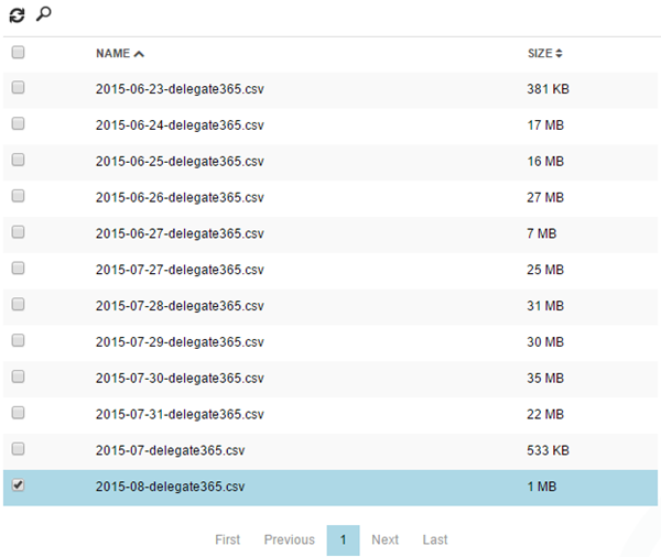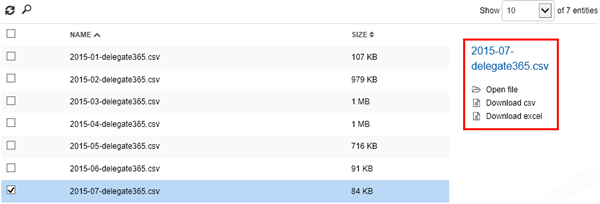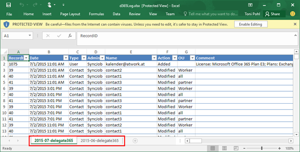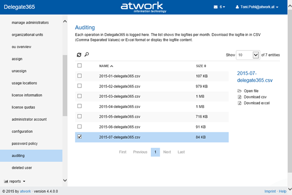 How does the new auditing look like? The menu administration / auditing now shows a list of files. Each calendar month is stored in one CSV file, f.e. 2015-07-delegate365.csv.