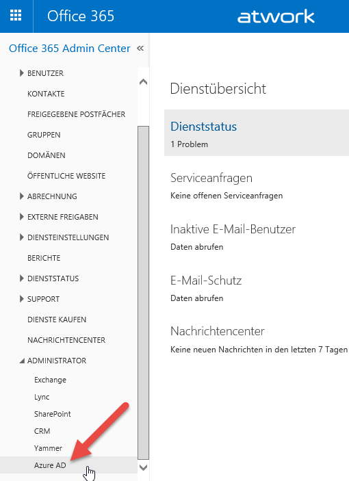 Grundsätzlich steht jedem Office 365 Tenant (https://portal.office.com/admin) eine Azure-Subscription zur Verwaltung des AAD zur Verfügung. Diese ist im Administrator-Menü mit dem Link zum “Azure AD” erreichbar.